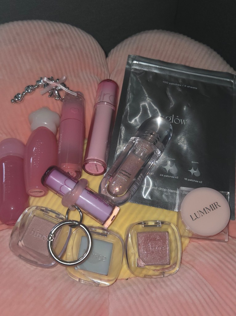 I picked up acne patches, a liquid glitter highlighter, and a pink glitter tube â perfect for adding a subtle glow to a more natural makeup look. đ